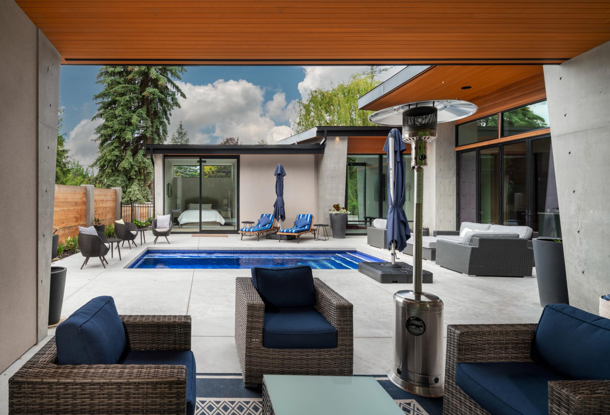 Tucked along Bellevue Creek in Kelowna, Creekside Rancher is a 3,100 sq. ft. single-level modern home that celebrates simplicity, structure, and flow. With bold architectural concrete forms and expansive glazing, this residence connects seamlessly to its forested setting. Natural materials, warm wood tones, and minimalist lines bring a sense of calm and grounded luxury to every space from the open-concept kitchen and living area to the private primary suite.