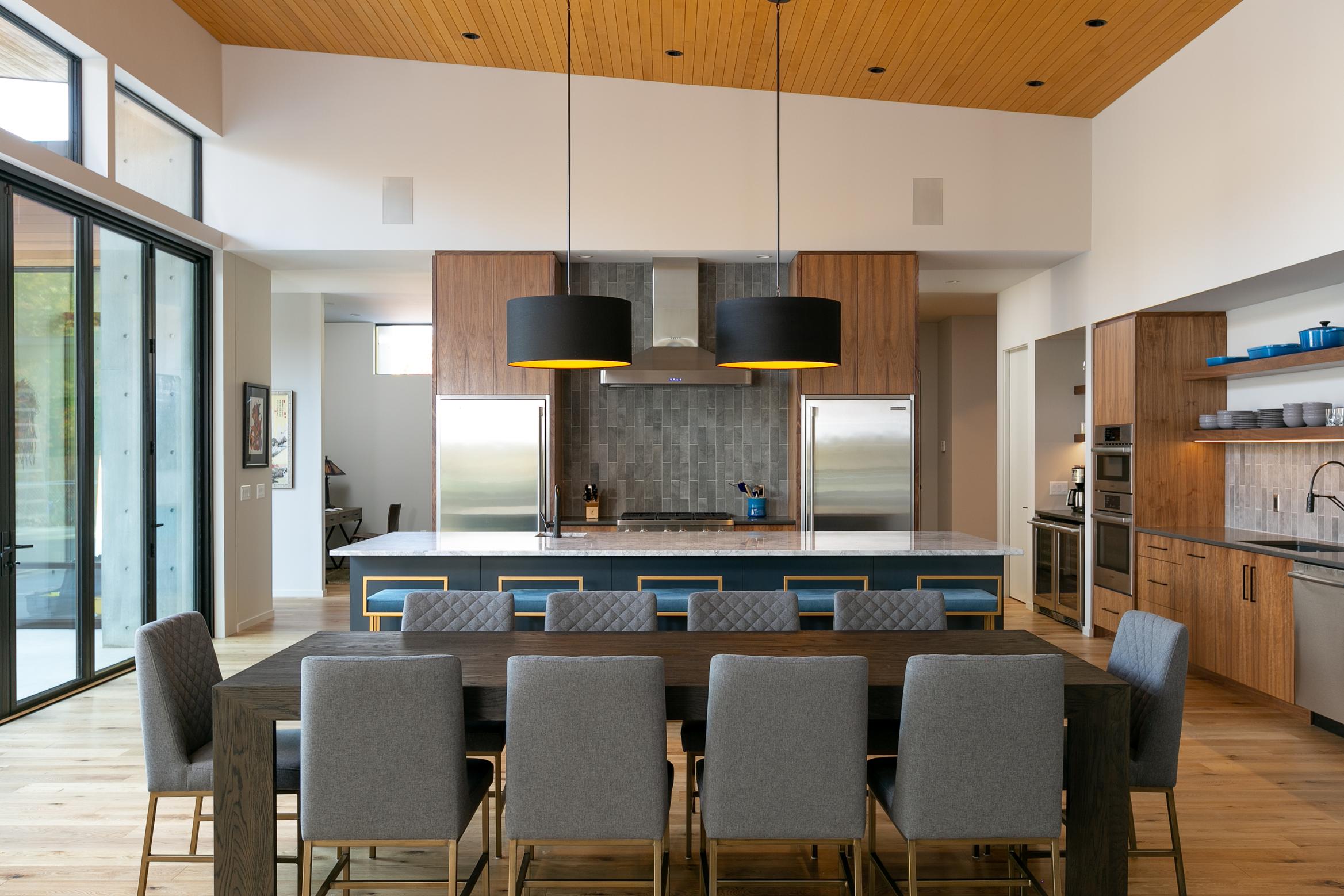Every major space opens directly to the outdoors. Large sliding glass doors extend the kitchen, living, and lounge areas onto covered patios that overlook Bellevue Creek. This connection to nature grounds the home and brings light, air, and calm into the heart of the design.
